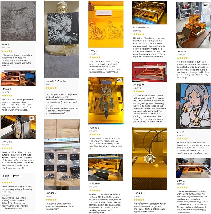 - 【World's 1st USB Child Lock】 When the safety lock is unplugged, the machine will cease to function, thereby preventing children from getting injured due to misoperation. The TOOCAA L2 machine also incorporates numerous excellent safety designs. With patented flame detection, tlt detection, and many other safety features, it safeguards you and your tools in every aspect, allowing you to focus on creation and production.