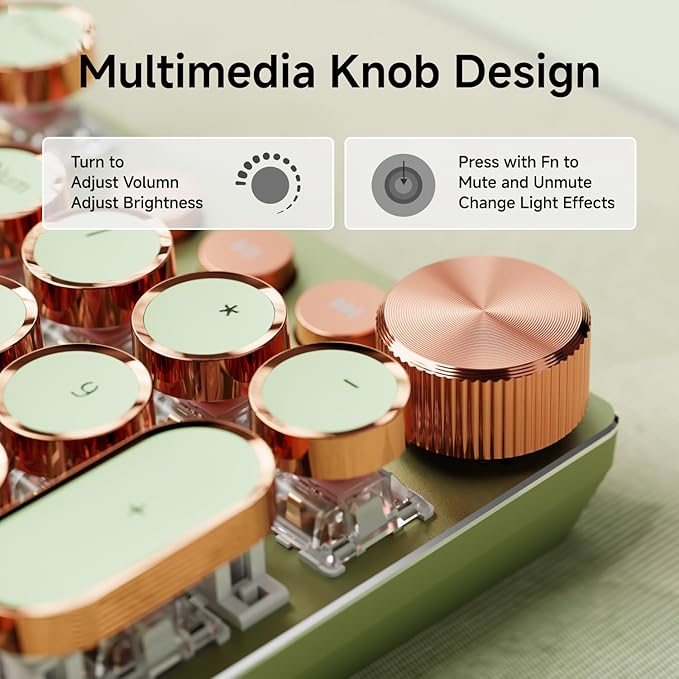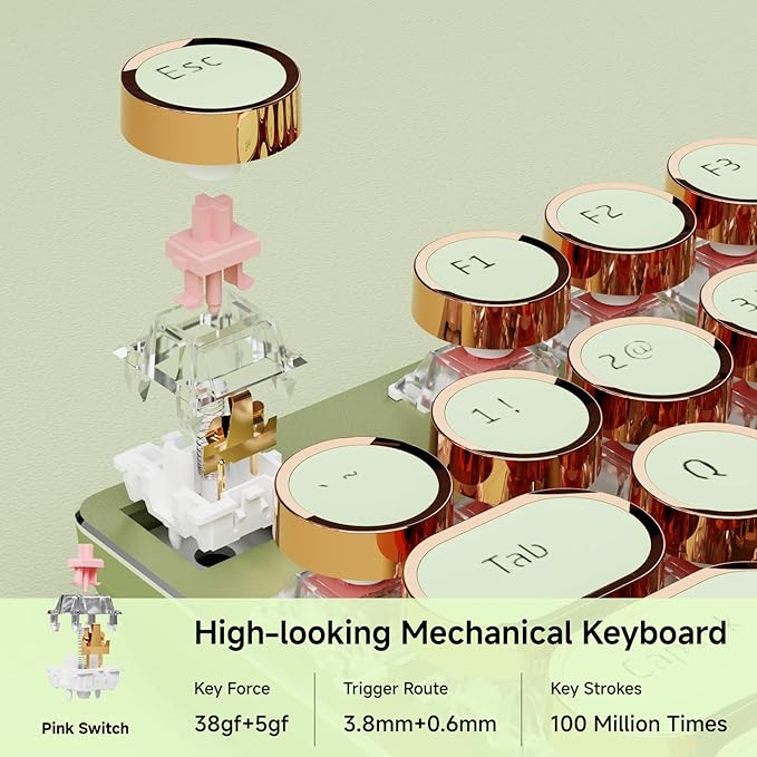 - 【Retro Typewriter Mechanical Keyboard】:The typewriter gaming keyboard has mechanical custom pink switches that feature a smooth linear feeling, and low resistance without a tactile bump feel. round keycaps of the punk mechanical keyboard look like a classical typewriter.keycaps have a matte texture and upgraded touch feel and the sound is quiet when the button is pressed lightly giving you a comfortable typing feeling and a stable click touch.