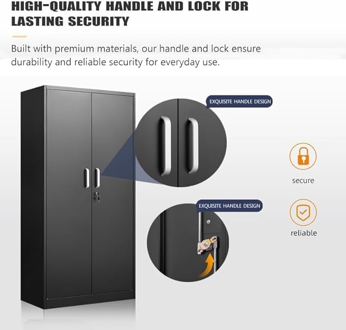 - Comprehensive Home Storage Solution: Adaptable for various home environments, this metal storage cabinet offers a secure and versatile storage solution for kitchen essentials, garage tools, and office documents. Whether used as a garage storage cabinet, kitchen pantry cabinet, or home office file cabinet, it effortlessly meets diverse storage needs with its robust build and practical design.