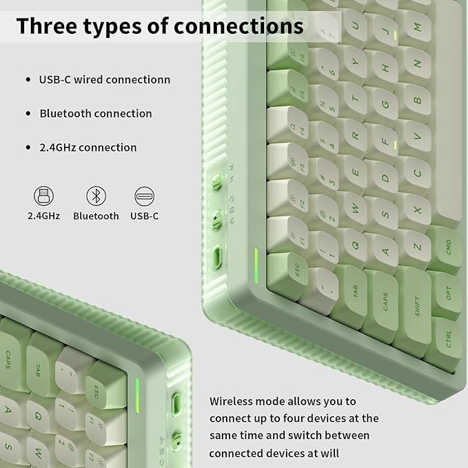- 【Multi-device switching】NuPhy Halo96 V2 Wireless Keyboard offers three connectivity options including Bluetooth 5.0, 2.4GHz, and USB C wired modes. The wireless mode allows for up to 4 devices to be connected at the same time,and switch between them easily by FN+ combination keys. Satisfy work, play and study needs.