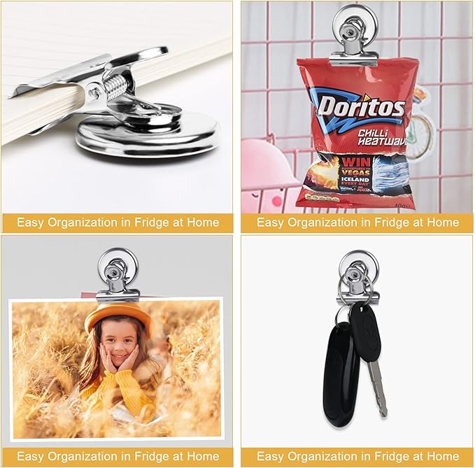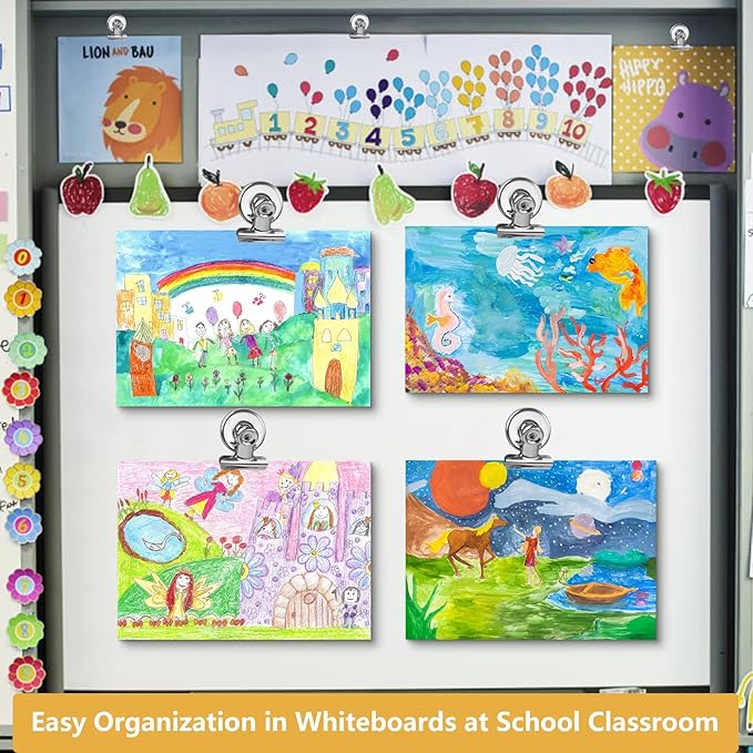 - Strong & Versatile Hold: These magnetic clips for refrigerator securely hold heavy card stock, photos, and artwork. Ideal as fridge magnets, magnet clips, or whiteboard magnets.