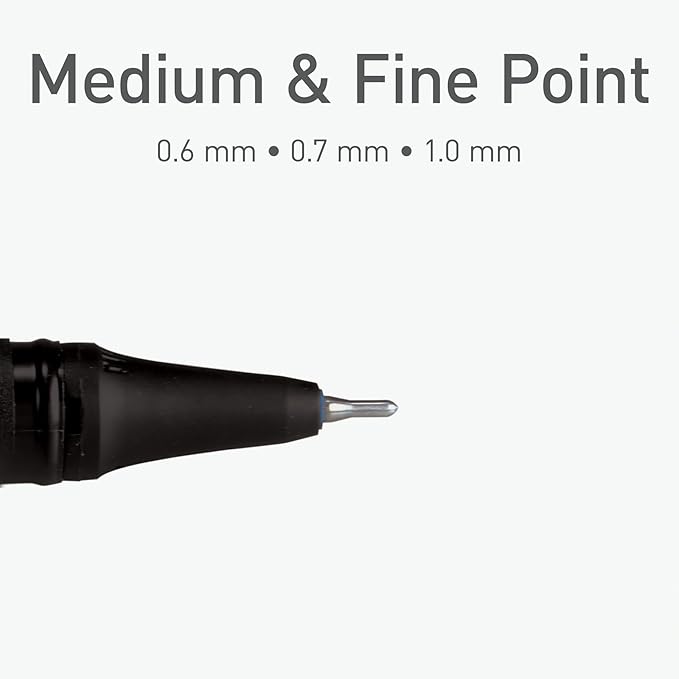 - Three different pen tips: 0.6 mm extra fine point tip, 0.7 mm fine point tip, and 1.0 medium point tip; fine tips create thin, precise lines and medium tips are broader for thicker lines
