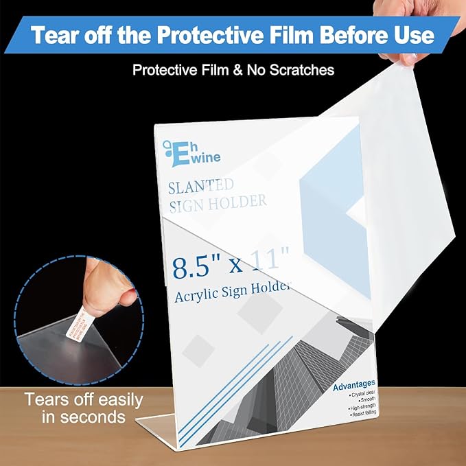 - Easy to Use: Insert 4 anti-slip pads into the base, Each of our Acrylic Sign Holder comes with a peel off film guide, follow the red arrows to peel off the film in seconds, and the plastic sign holder has an opening on its side for easy paper insertion