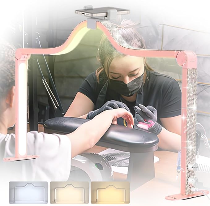 Half Moon Nail Desk Light, 35inch Foldable LED Nail Tech Lamp for Desk, 3 Color Adjustable 3000K-6000K Dimmable Manicure Table Lamp, 45W Large Nail Light with Phone Holder for Beauty, Lash (Pink)