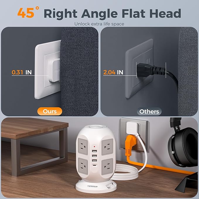 - Space Saving Design: 4-side compact design extension cord tower takes up little space on your desk, cleans various cords and create a neat and tidy space; Stable base with 4 rubber feet at the bottom, efficiently keeps this surge protector tower from slipping and sliding