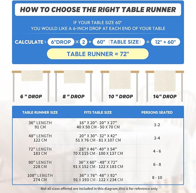 - Fits Table Size : This table runner is 13 x 90 inch, appropriate for a table that can seat 6-8 people, better match your table and give you a delightful dining experience