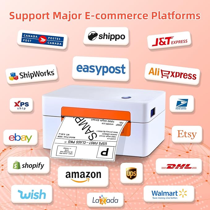 - 【Flexible Platform Compatibility】 This small business label printer is flexible and compatible with multiple platforms and can be compatible with major logistics and e-commerce such as UPS, eBay, Amazon, Shopify, FedEx, DHL and more. It is not only suitable for printing many types of labels such as address, shipping, postage and binding labels, but also supports printing of personalized labels.