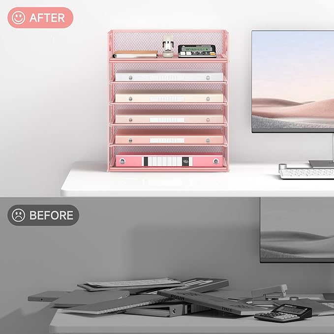 6 Tray Paper Organizer Letter Tray with Handle - Mesh Desk File Organizer, Paper Sorter Organizer for Office, Home or School File Folder Holder - Pink