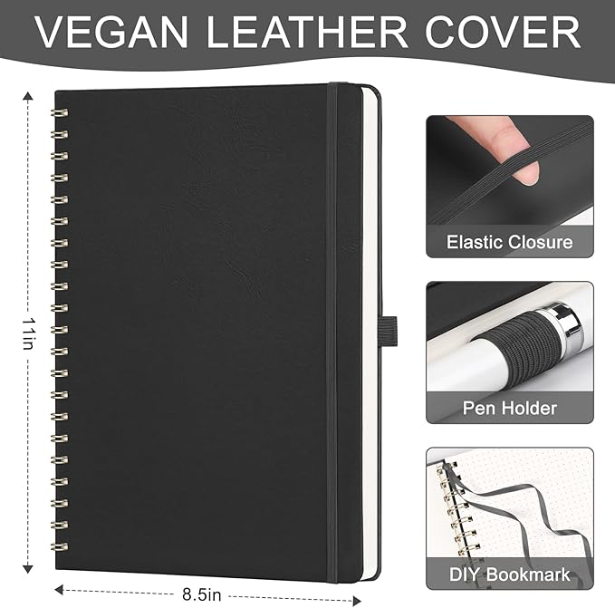 - HARDCOVER LEATHER JOURNAL: This spiral notebook features a durable, waterproof vegan leather cover that protects your notes from damage. The double-wire binding allows for easy folding and 180° lays flat for convenient writing