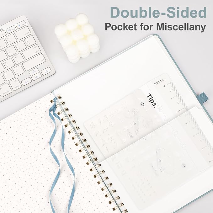 - PRACTICAL LAYOUT: Equipped an elastic band, a pen holder and removable bookmark ruler to keep your notebook organized. Comes with a DIY bookmark with a ribbon for self-attachment to the spiral, serving as a bookmark. Features a double-sided pocket for storing miscellany and 2pcs journal stencil for adding creative to your pages