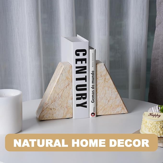 Marble Bookends,Natural Decorative Bookend for Shelves, Non-Skid Book End for Heavy Books, Idea Book Stoppers & Holder for Desk Bookshelf Decor, Modern Home Decor Cream Color Book Ends, Set of 2