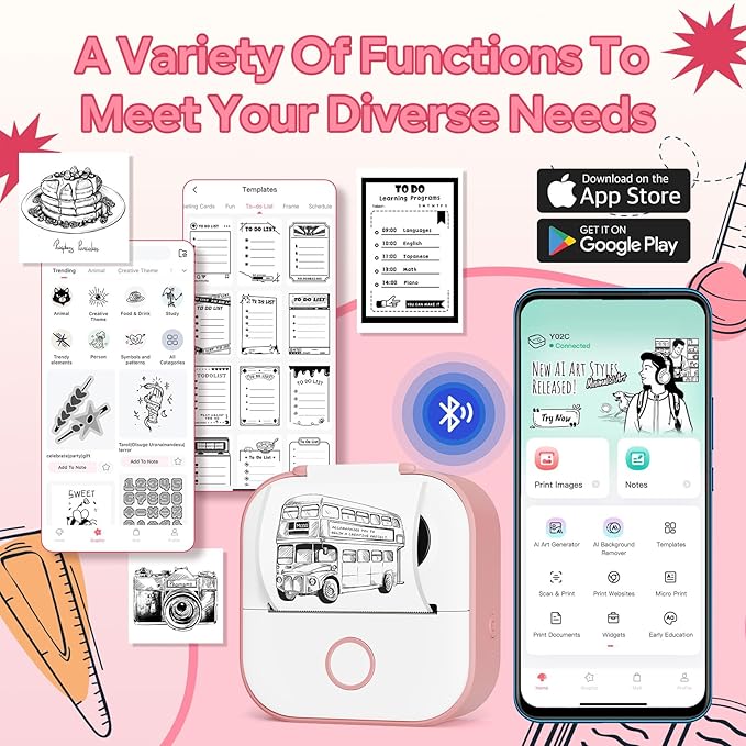 - Bluetooth sticker printer can connect to phones and tablets: The Y02C mini printer for phone is compatible with iOS and Android system devices. After downloading the APP, it connects with one-click via Bluetooth. The APP provides a variety of patterns, fonts, and templates in different themes to bring fun to your printing