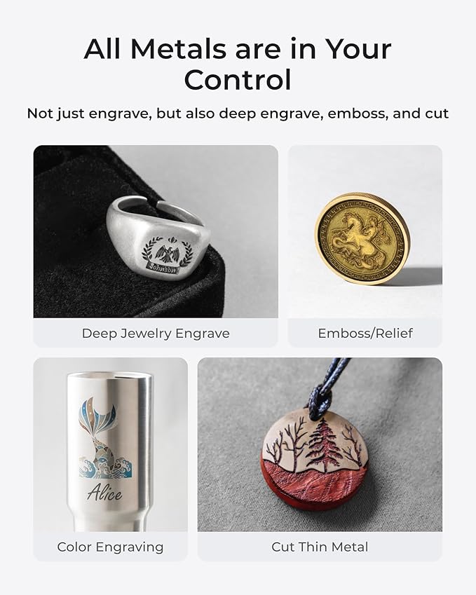 - 3D Embossing and Deep Engraving: With 20W power in both fiber and diode lasers, the F1 Ultra laser engraving machine handles intricate, multi-level 3D engraving and deep engraving on various materials, including metal, wood, and rock, creating high-value items.