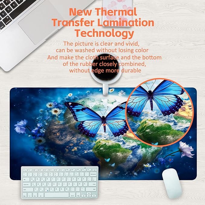 Desk Mat, Earth Surrounded by Flowers Desk Pad, Blue Butterfly Large Gaming Mouse Pad, 31.5"x15.7", Extended Big Computer Keyboard Mouse Pad with Non-Slip Base and Stitched Edge