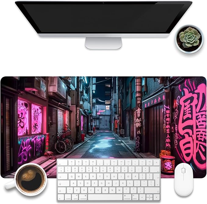 Desk Pad, Anime City Street Scene Desk Mat, Pink Neon Street Large Gaming Mouse Pad for Desk, 31.5"x15.7" Extended Big Computer Keyboard Mouse Pad with Non-Slip Base and Stitched Edge