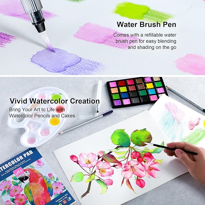 - Variety of Drawing Mediums: Includes 12 graphite pencils, 12 fluorescent colored pencils, 4 pastel pencils, 3 white charcoal pencils, 12 watercolor pencils, 12 oil-based colored pencils, 6 pastel sticks, and 6 black charcoal pencils. Also features 24 watercolor cakes and 12 metallic colored pencils, allowing you to experiment with different mediums and achieve a range of effects in your art.