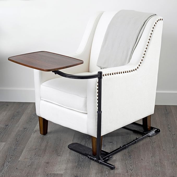 - Modern Design: The black base and walnut tray seamlessly blend in with any home, making it the perfect living room accent table; the adjustable curved-arm wraps around the armrest and ensures optimal tray placement directly in front of you