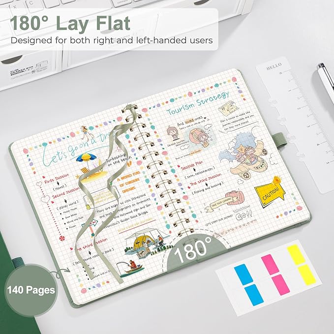 - PRACTICAL LAYOUT: Equipped with an elastic band, a self-adhesive pen holder, and a removable bookmark ruler to keep your notebook organized. Comes with a DIY bookmark with a ribbon for self-attachment to the spiral, serving as a bookmark. Features a double-sided pocket for storing miscellany and 1 doodle stencil, which can help you to achieve DIY painting art projects