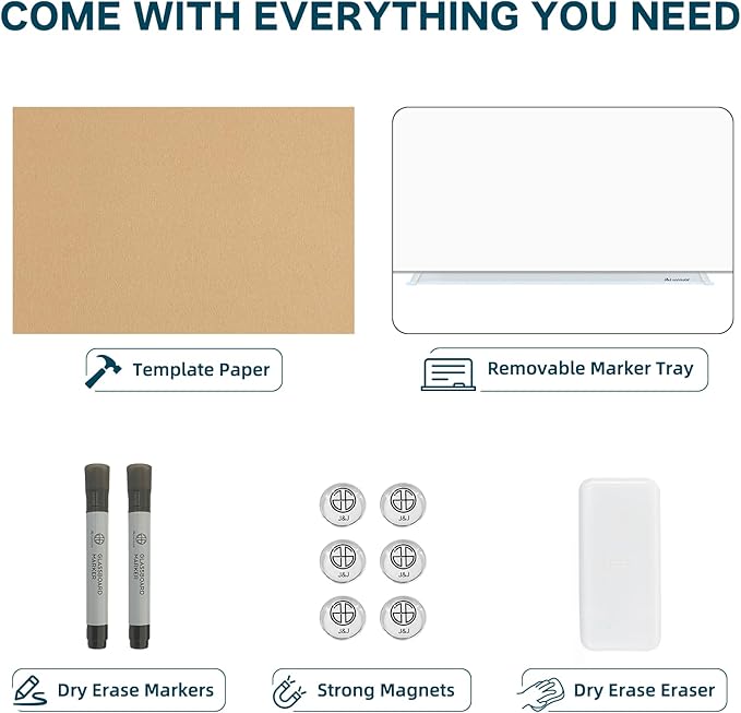 - 【ACCESSORIES INCLUDED】: The package includes 2 dry erase markers, 6 magnets, 1 glass whiteboard eraser and 1 removable aluminium marker tray for mounting. One-stop shopping. It's a great gift idea for your workmate, boss or spouse which can enhance the office/ house atmosphere
