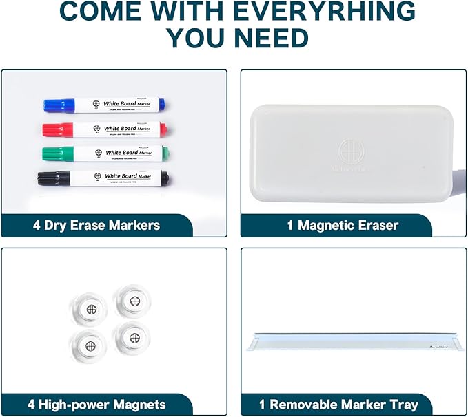 - 【ACCESSORIES INCLUDED】: The package includes 4 dry erase markers, 4 magnets, 1 glass whiteboard eraser and 1 removable aluminium marker tray for mounting. One-stop shopping. It's a great gift idea for your workmate, boss or spouse which can enhance the office/ house atmosphere