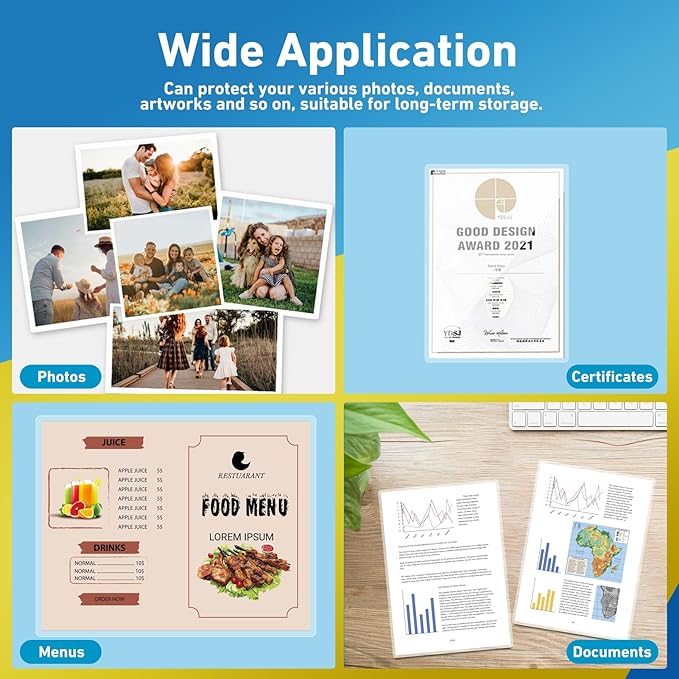 - MANY USES: Designed for protecting and preserving documents, laminating photos, office documents certificates, Insurance card, maps, awards, bookmark, calendars, kid's artwork'recipe cards, menu and more.It can be used in classroom, home and office.
