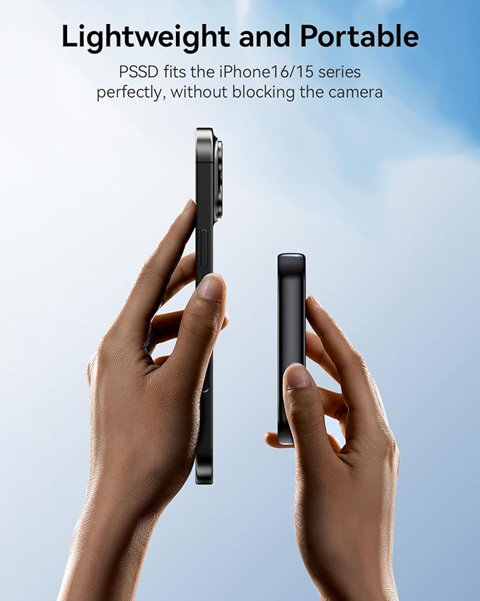 - 【Magnetic Design】PSSD can be directly attached to iPhones and phone cases with MagSafe support, and it also includes a magnetic ring for attachment to devices and cases without built-in magnets. This makes it the ideal choice for mobile photography enthusiasts, allowing you to store a large number of high-resolution photos and videos anytime, anywhere, combining portability and efficiency perfectly.!!Note: When using the PSSD with a phone case, it is recommended to use the included magnetic ring to prevent detachment due to insufficient magnetic force.
