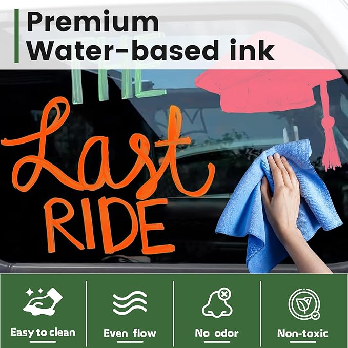 - EASY TO USE & CLEAN: Our liquid chalk markers erasable are designed for effortless application and clean-up. To use, simply put the cap back on, shake the marker thoroughly, press the tip to saturate it with ink, and test it on paper. Erasing is equally straightforward, as our dry & wet erase markers wipe clean with a dry or damp cloth, leaving no residue.