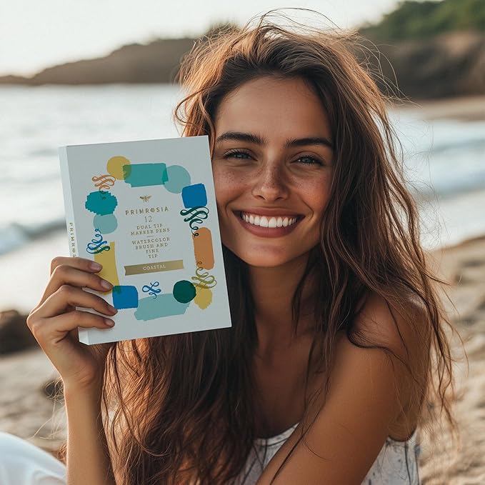 Primrosia 12 Dual Tip Watercolor Marker Pens - Fine Tip & Brush Tips, Professional Quality, 4 x Sticker Sheets, Blendable, Non-Toxic, Perfect for Calligraphy, Drawing & Coloring. (Coastal)