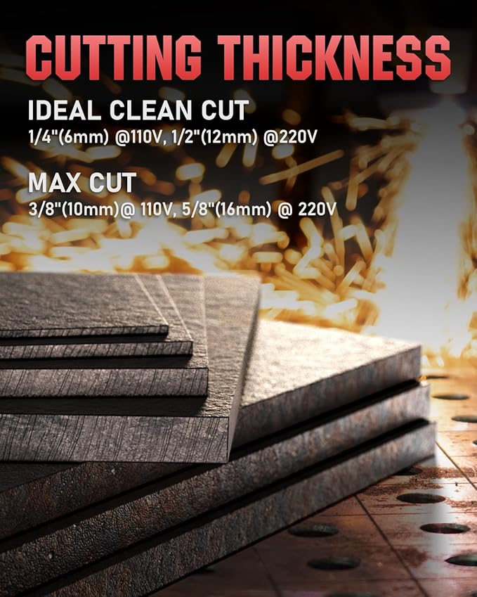 - POWERFUL CUTTING CAPACITY: 20-50A output, Ideal Clean Cut: 1/4''(6mm) @110V, 1/2"(12mm) @220V, Maximum Cut: 3/8''(10mm)@ 110V, 5/8''(16mm) @ 220V. Uses non-hazardous compressed air to cut stainless steel, alloy steel, mild steel, copper, and aluminum. Note: When making the maximum thickness cut, slow down the cutting speed appropriately to ensure excellent cutting results