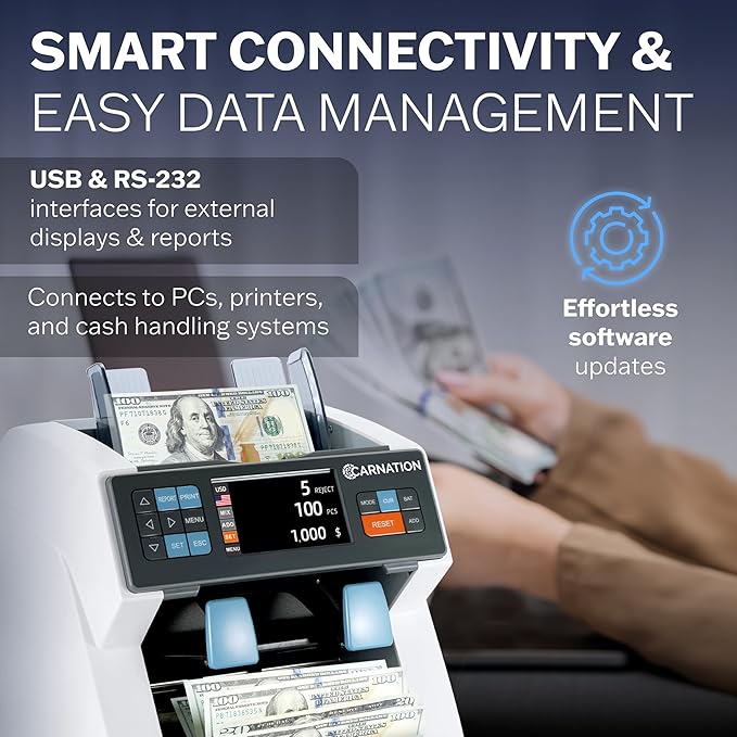 Carnation CR8 Mixed Denomination Money Sorter with Built-in Printer – Bank-Grade Bill Counter with Counterfeit Detection, Serial Number Tracking, Multi-Currency Support & 2 CIS Sensors