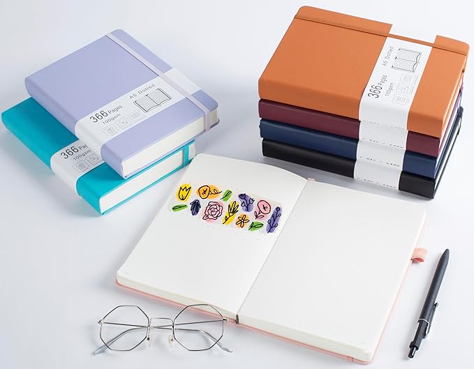 - Comfortable Writing: Light Ivory paper to protect your eyes. 100gsm weight paper is thicker than normal, suitable for fountain pens, ballpoint pens, highlighters to write on both sides of page without bleeding through, smearing or ghosting. Dot spacing is 5x5mm and 180Β°lay flat to give you comfortable writing experience.