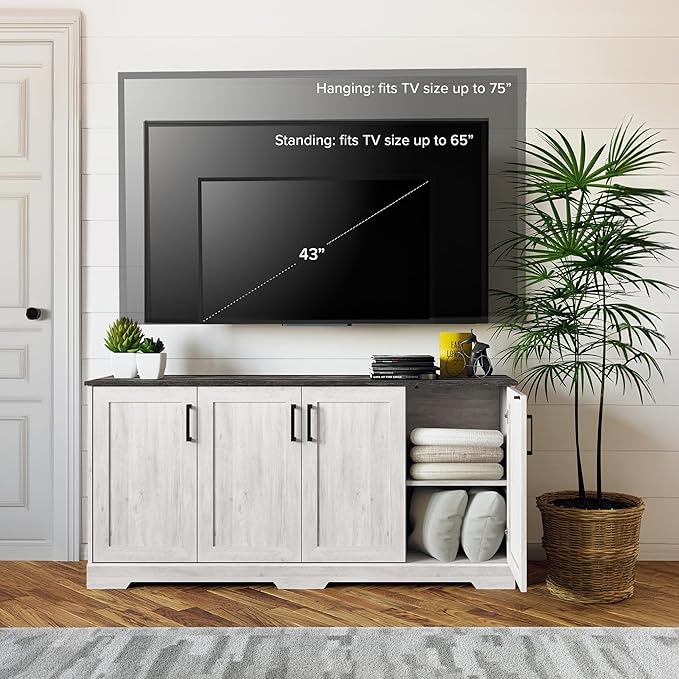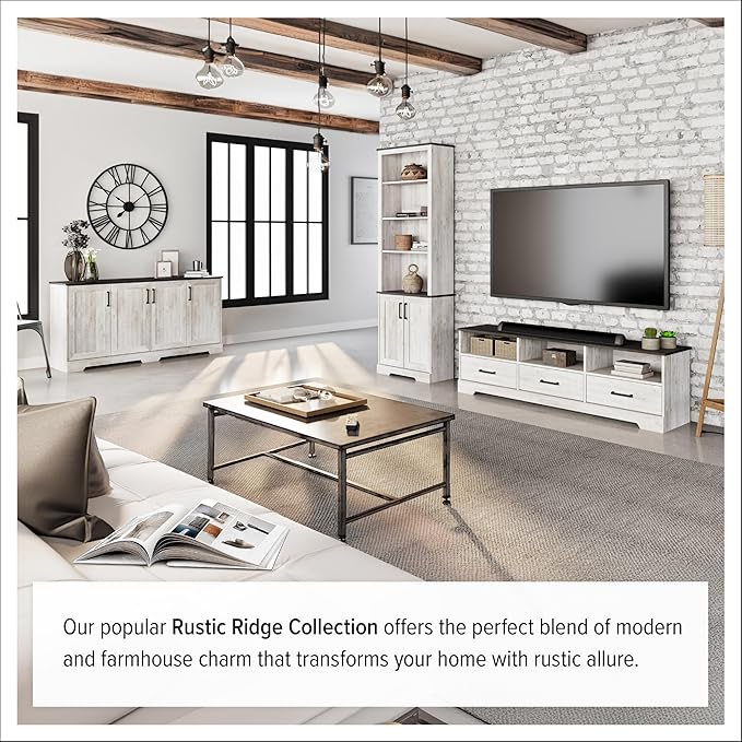 Prepac Rustic Ridge 4 Door Console Table with Storage, Washed White Storage Cabinet with Doors and Shelves, Sideboard Storage Cabinet 66" W x 31.75" H x 16" D, ACBG-1620-1