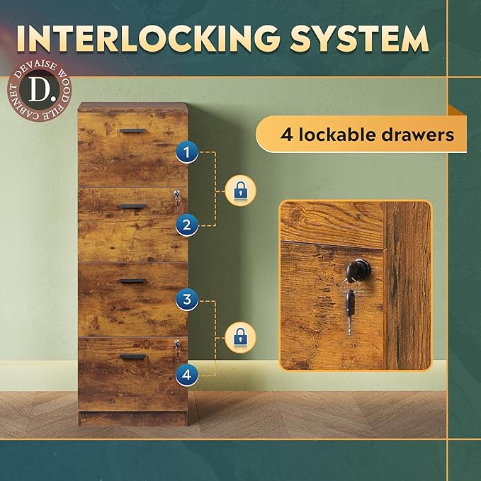 DEVAISE 4 Drawer File Cabinet with Lock, Vertical Filing Cabinet for A4/Letter Size Files, Wood Storage Organizer for Home Office, Rustic Brown