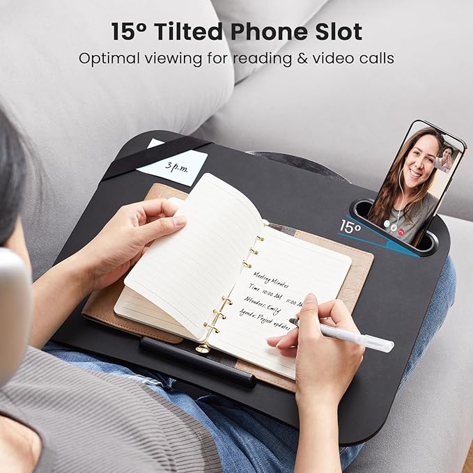 - 15Β° Angled Phone Slot: The cushioned lap desk enhances multitasking with a built-in 15Β° phone holder. Keep your smartphone at the ideal viewing angle for video calls or virtual meetings while you work.
