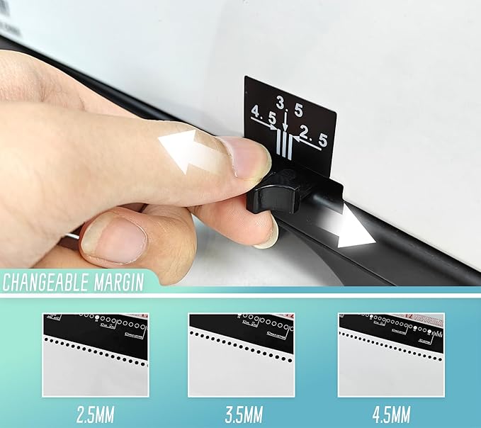 - 【Easily Adjustable】- Features adjustable depth margins (2.5mm, 3.5mm, and 4.5mm) and side margin control for precise hole punch alignment, regardless of thickness.