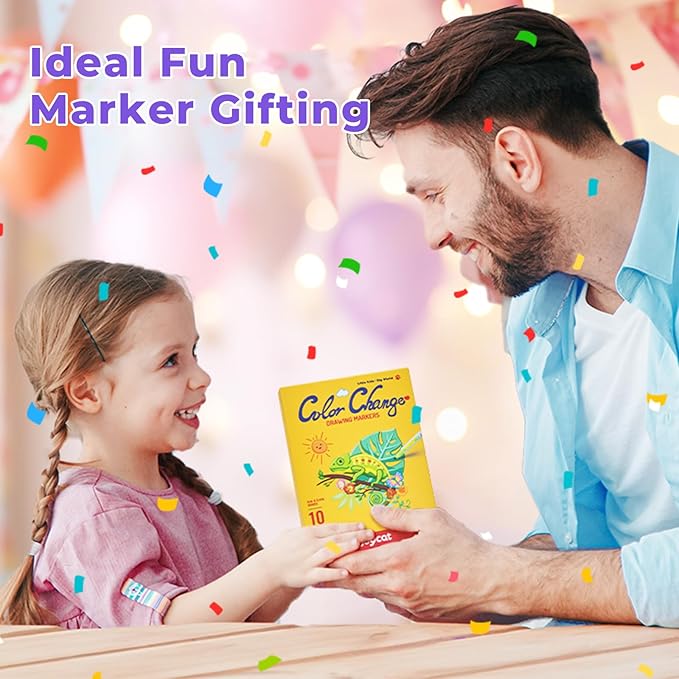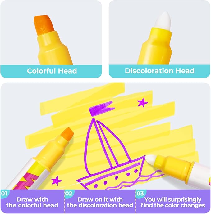 - 【EASIER TO CREATE DESIGNS】First color with the regular side of the joycat color changing pens, then use the white top to observe the color change. Differentiate from other color changing pens, our body of the pen come with color changing markers, making it easier for you to create and know the changing color before you draw.Watch your artwork go through a wonderful transformation and turn it into a creative activity that is exciting and engaging for kids of all ages. Color changing markers will double the fun when kids go back to school!