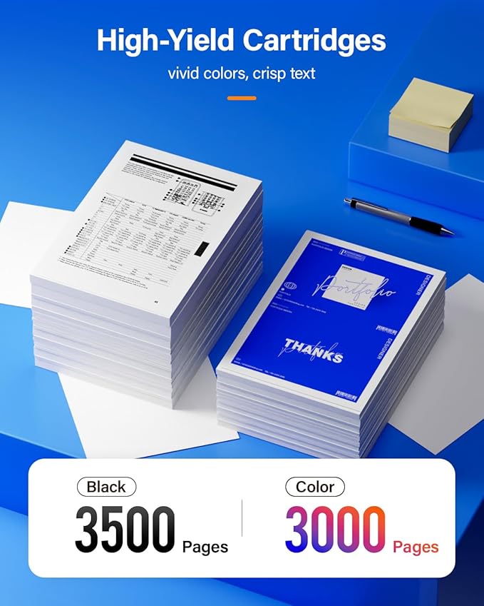 - 【Page Yield】Up to Black is 3,500 pages per black cartridge and Color is 3,000 Pages per color cartridge (Letter/A4, at 5% Coverage).