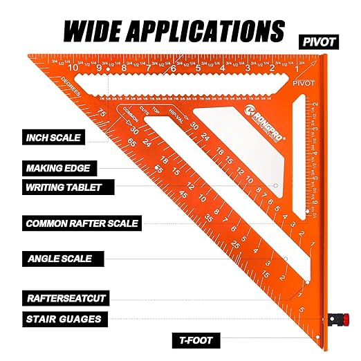 - 【Convenient and comfortable design】RONGPRO rafter square is convenient to hang and store when not in use with humanized design. The edges and corners of each triangle are polished by special craftsmanship, so that it is smooth and does not hurt your hands.