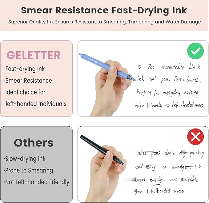 - ✍️ Smear Resistance Fast-Drying Ink: GELETER's exclusive ink is of archival standard, ensuring our durable inks are of superior quality and resistant to smearing, tampering, and water damage; an ideal choice for professionals, hobbyists, and who in-between.