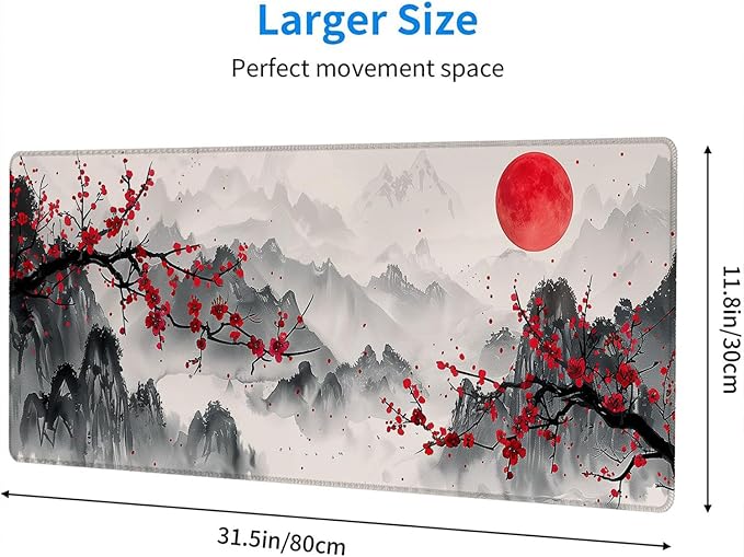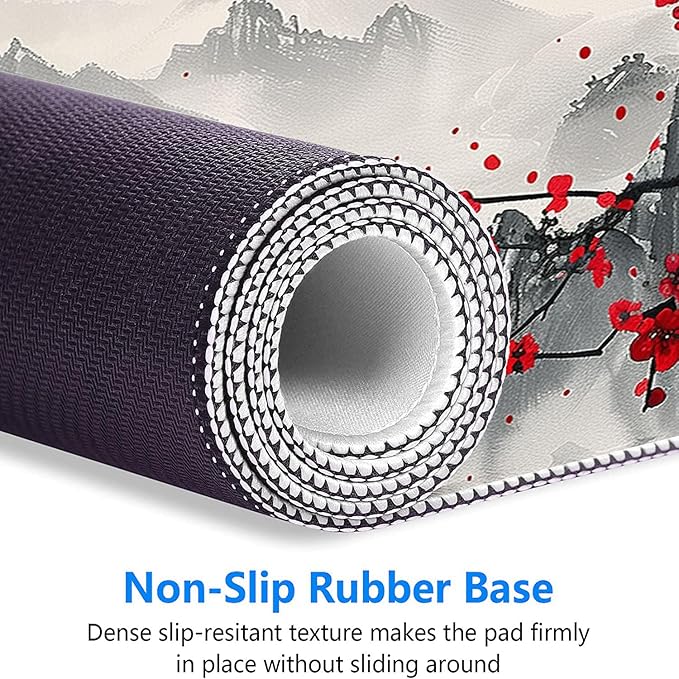 Watercolor Cherry Blossom Gaming Mouse Pad - Chinese Ink Painting Mountain Desk Mat With Stitched Edge Non-Slip Base for Office Computer Keyboard Laptop Home 31.5"x11.8"