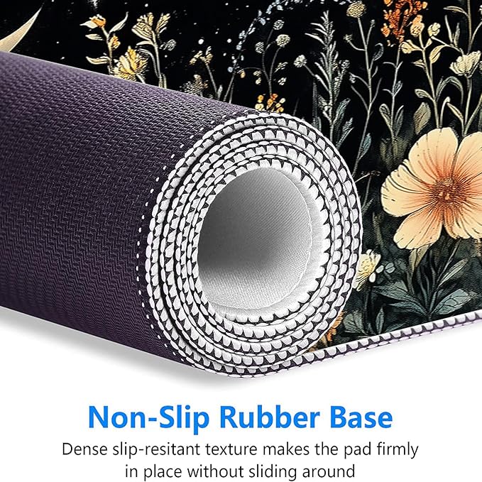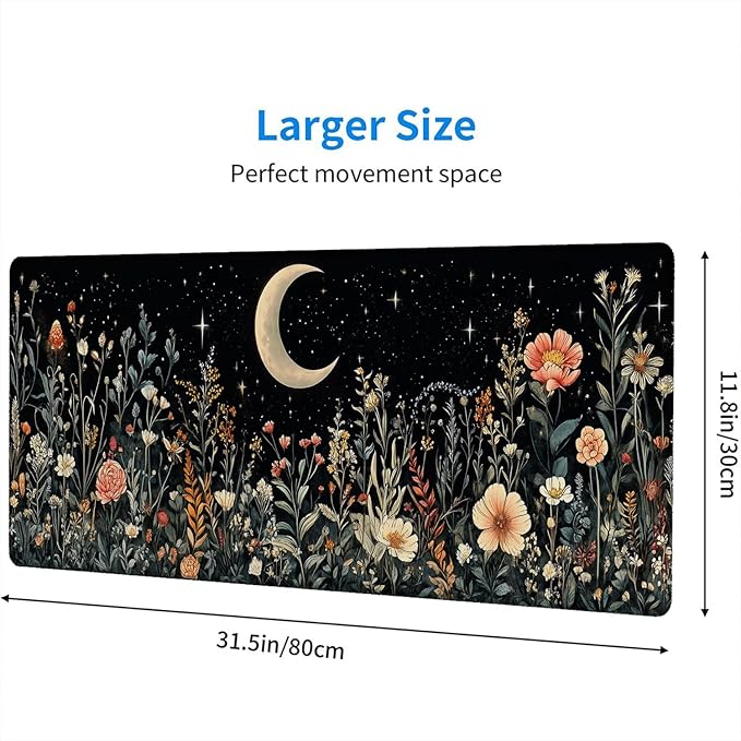 Cute Mystical Plants Desk Pad Whimsical Moon Stars Extended Gaming Mouse Mat with Stitched Edge Non-Slip Base - Big Office Computer Keyboard Laptop Home - 31.5"x11.8"