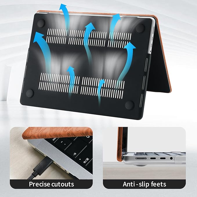 - STAYING COOL & DURABILITY: The bottom shell has two rows of vent holes and raised rubber feets for accelerate air circulation to achieving maximum heat dissipation. 4 rubber feets also provide stability and a non-slip grip, keeping your MacBook Air 13.6 inches in place, safer and more stable in use. The retro leather mac book air 13 case takes into account both durability, portability and protection, suitable for using in school, office, business trip or outdoor use