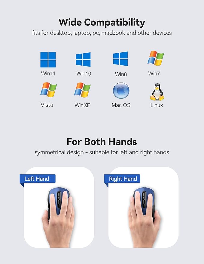 - Wide Compatibility & Low Power Warning: The wireless mouse for laptop can be well-compatible with Windows 11/10/8/7/XP, Vista 7/8 and Linux, etc. Fits desktops, laptops, PC, Macbooks, and other devices; and the LED battery indicator warns you if the battery is running low.