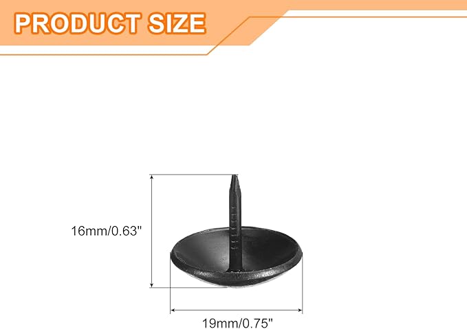 - Specifications: Material: Carbon steel; Color: Black; Diameter of nails head: 19mm/0.75inch; Shank length: 16mm/0.63inch; Package Content: 100Pcs x Upholstery Tacks Nail Pins