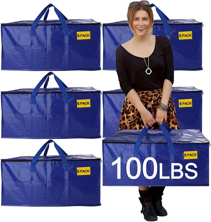 6 Pack Waterproof Moving Bags with Strong Zippers and Reinforced Handles, Real 100lb Capacity Extra Heavy Duty Large Storage Totes for Packing & Moving Storing, Alternative to Moving Boxes -95L,Blue