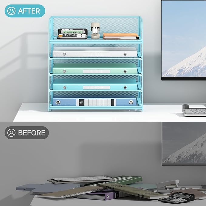 - [5-Tier Desk Organizer] The 5-Tier desktop organizer is capable of storing A4 paper/paper files, file holders, small laptops, business card holders and calendars, etc. The 5 tier office desk organizer provides plenty of storage space to keep your desktop neat and clean.