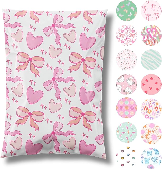 6x9 Designer Poly Mailer 100 Pack Heavy Duty Waterproof Self Seal Shipping Bags for Small Business Large Mailing Envelopes Bulk Tear Resistant Packaging Coquette Bows Hearts