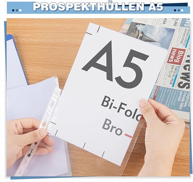 - Double-Sided Sheet Protector: 100pcs clear A5 binder pocket per package.Size is:21.5 x 17.3 cm.Our A5 plastic wallets multi-punched pockets will fit most A5 ring mechanisms and provides double capacity that you can put total 2 in both sides of the sheet. It is ideal for frequently referenced documents and long-time storage.
