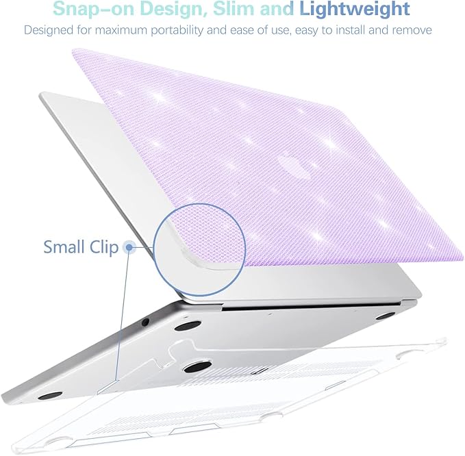- Easy Installation: Ultra-thin and lightweight, this MacBook Air 13.6 inch glitter case offers reliable durability without adding unnecessary bulk or weight to your device. It features micro-clips that snap securely to your laptop for effortless installation and removal. In addition, the bottom cover has ventilation slots to help dissipate heat and prevent overheating, while the four rubber feet provide stability and a non-slip grip.