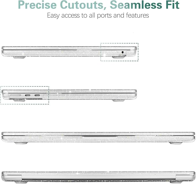- Easy Installation: Ultra-thin and lightweight, this clear sparkle MacBook Air 15 inch case offers reliable durability without adding unnecessary bulk or weight to your device. It features micro-clips that snap securely to your laptop for effortless installation and removal. In addition, the bottom cover has ventilation slots to help dissipate heat and prevent overheating, while the four rubber feet provide stability and a non-slip grip.